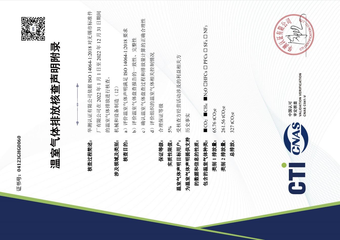 热烈庆祝公司荣获:“温室气体排放核查声明”证书